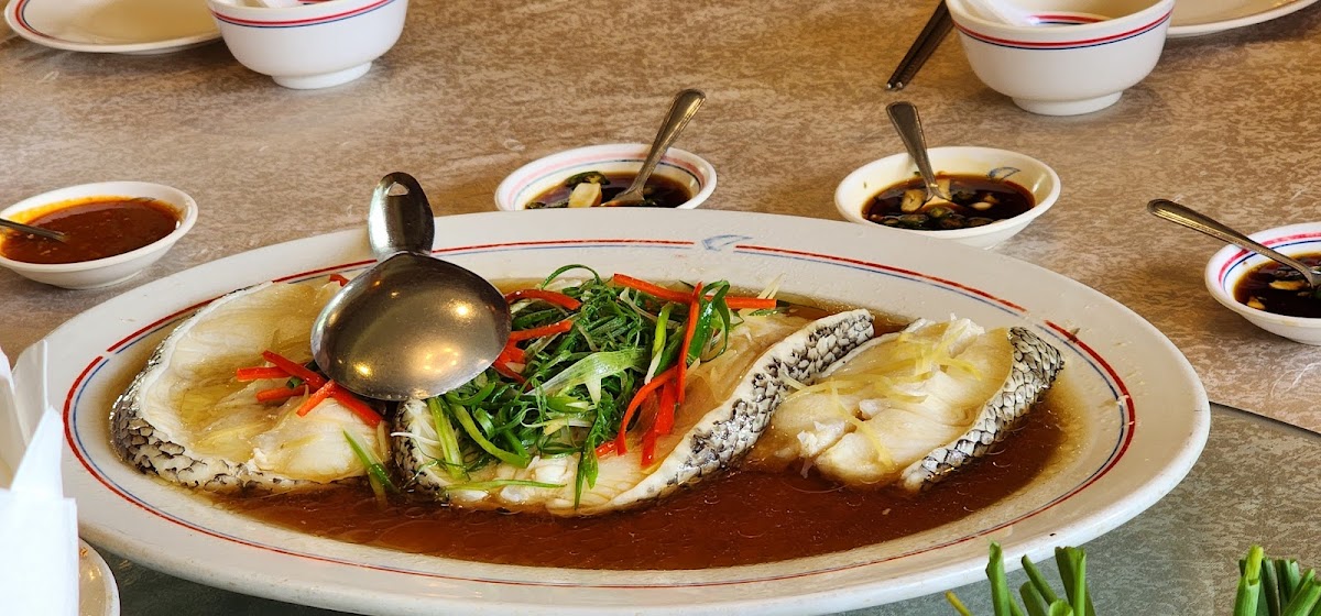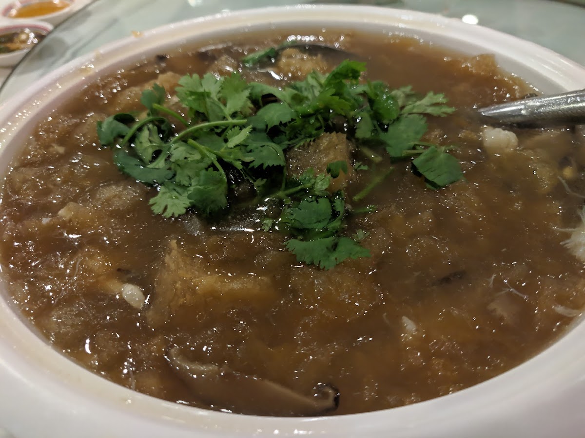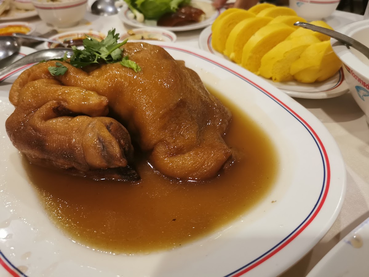 A pretty big Chinese restaurant serving many types of delicacies. Restaurant is old but well maintained,place is clean and service is top notch.--4* We wanted to try their suckling piglet but was told they only sell whole piglet. Only two of us so we decided to try their Peking Duck. The skin is crisp with duck fats aroma, dipping sauce is tad watery in viscosity. The dough skin is pretty soft but the spring onion is young and crunchy. Presentation is not that enticing but taste wise is not too bad.The duck meat is fried in black pepper sauce which is very average --4* The Shark Find is braised with this delicious broth, it is tasty and well balance. --4.5* Not a bad choice if you are tire of Thai foods in Hat Yai.
